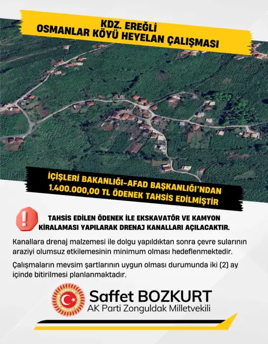 Ak Parti Zonguldak Milletvekili Saffet Bozkurt, Kdz. Ereğli Osmanlar Köyü heyelan çalışması için İçişleri Bakanlığı-AFAD Başkanlığı’ndan 1.400.000,00 TL ödenek tahsis edildiğini açıkladı.