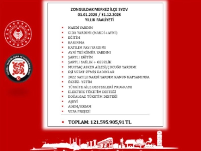 Zonguldak Merkez İlçe Sosyal Yardımlaşma ve Dayanışma Vakfımız, 2023 yılında sosyal yardım alma şartlarını taşıyan vatandaşlarımıza toplam 121.595.905,91 TL destek ödemesi gerçekleştirdi.