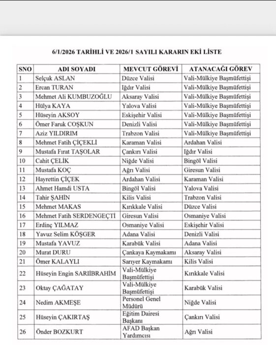 Cumhurbaşkanı Erdoğan’ın imzası ile Resmi Gazete’de yayımlanan Valiler Kararnamesi’ne göre; 7 vali merkeze çekilirken, 19 valilikte görev değişikliği oldu.