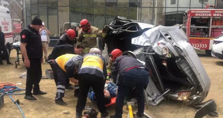 Kaza, saat 11.00 sıralarında Orhan Gazi Mahallesi 440 Bulvarı’nda meydana geldi. Mahmut Sami D.’nin kontrolünü yitirdiği 81 AEL 954 plakalı otomobil, virajlı yolda yaklaşık 20 metre yükseklikten Düzce Teknopark yerleşkesinin otoparkına düştü. Sürücü Mahmut Sami D. ile yanındaki Cengizhan O., araç içinde sıkıştı. Çevredekilerin ihbarı üzerine kaza yerine sağlık, itfaiye ve polis ekipleri sevk edildi. Ağır yaralanan 2 kişi, itfaiye tarafından otomobilin tavanı kesilerek çıkarıldı. Sağlık ekibinin ilk müdahalesi sonrası hastaneye kaldırılan yaralıların hayati tehlikelerinin bulunduğu öğrenildi.
