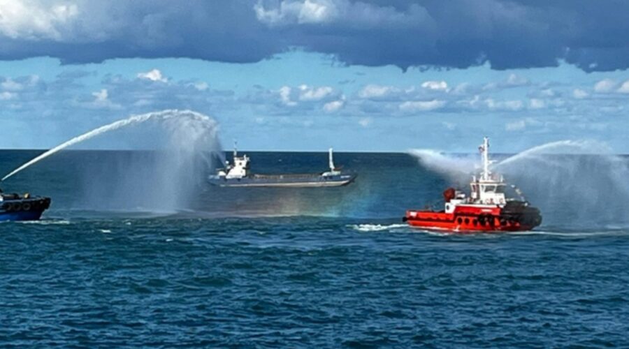 Zonguldak’ta Cumhuriyet Bayramı kutlamaları kapsamında çeşitli kurumlara ait römorkörler, denizde su gösterisi yaptı; renkli görüntüler oluştu.