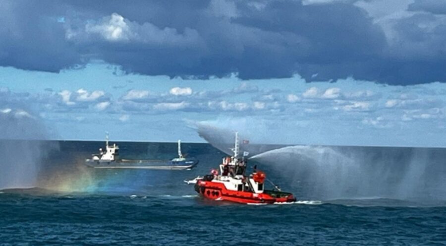 Zonguldak’ta Cumhuriyet Bayramı kutlamaları kapsamında çeşitli kurumlara ait römorkörler, denizde su gösterisi yaptı; renkli görüntüler oluştu.