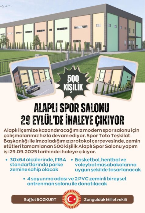 Alaplı ilçemize kazandıracağımız modern spor salonu için çalışmalarımız hızla devam ediyor. Spor Toto Teşkilat Başkanlığı ile imzaladığımız protokol çerçevesinde, zemin etütleri tamamlanan 500 kişilik Alaplı Spor Salonu yapım işi 29.09.2025 tarihinde ihaleye çıkıyor.