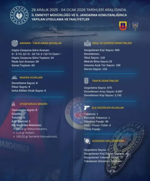 Zonguldak Valiliği, İl Jandarma Komutanlığı ve İl Emniyet Müdürlüğü’nce 29 Aralık 2025 – 4 Ocak 2026 tarihleri arasında yapılan uygulama ve faaliyetlerinin detaylarını paylaştı.