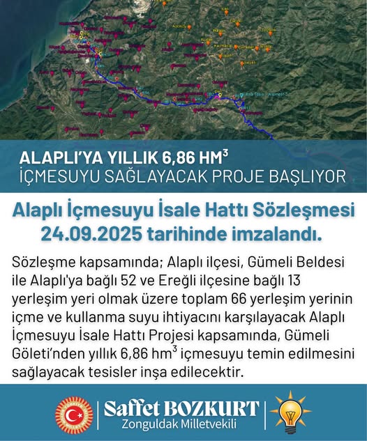Sözleşme kapsamında; Alaplı ilçesi, Gümeli Beldesi ile Alaplı’ya bağlı 52 ve Ereğli ilçesine bağlı 13 yerleşim yeri olmak üzere toplam 66 yerleşim yerinin içme ve kullanma suyu ihtiyacını karşılayacak Alaplı İçmesuyu İsale Hattı Projesi kapsamında, Gümeli Göleti’nden yıllık 6,86 hm³ içme suyu temin edilmesini sağlayacak tesisler inşa edilecektir.