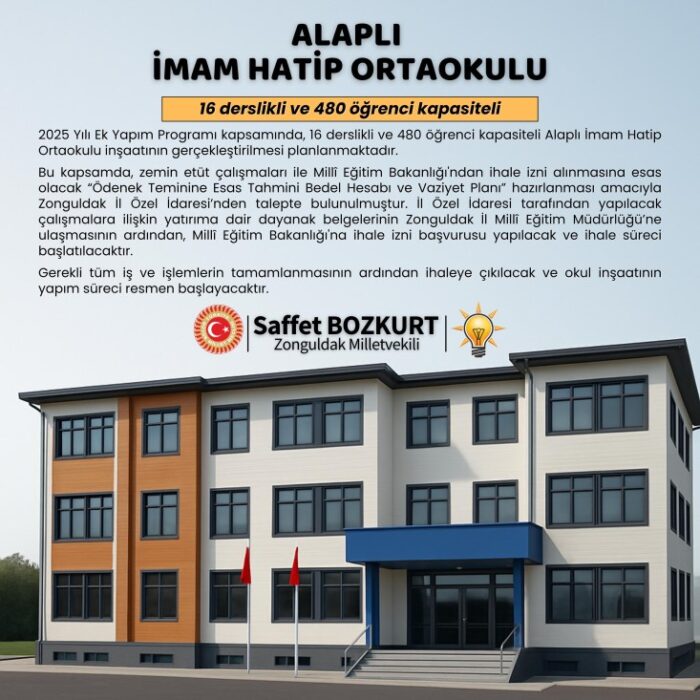 2025 Yılı Ek Yapım Programı kapsamında, 16 derslikli ve 480 öğrenci kapasiteli Alaplı İmam Hatip Ortaokulu inşaatının gerçekleştirilmesi planlanmaktadır.