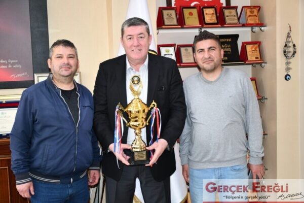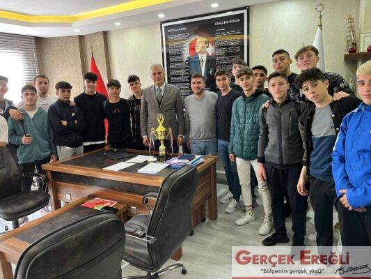 Zonguldak U-18 Liginde İl Şampiyonu olan Zonguldak Ereğli Spor (ZES) şampiyonluk kupası ile Alaplı Belediye Başkanı Nuri Tekin ve Ereğli İlçe Milli Eğitim Müdürü Harun Akgül’ü ziyaret ettiler.