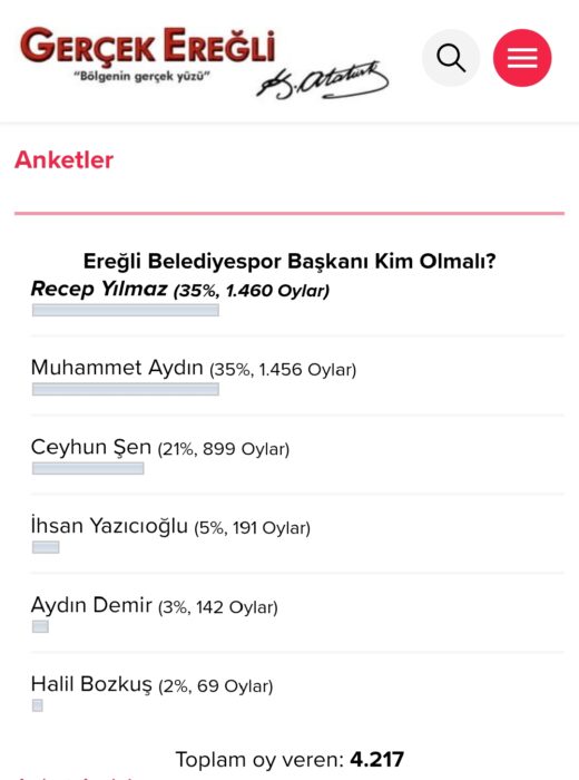 Recep Yılmaz, Muhammed Aydın, Ceyhun Şen, İhsan Yazıcıoğlu, Aydın Demir, ve Halil Bozkuş’un yarıştığı ankette en yüksek oyu Recep Yılmaz aldı.