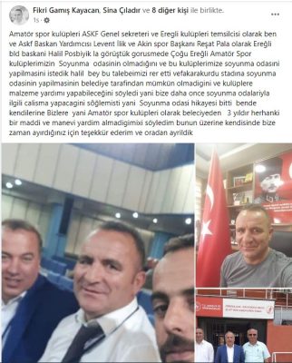 Daha önce amatör spor kulüplerinden soyunma odası yapılmak için toplanan dilekçeler neticesinde girişimlerde bulunan Zonguldak ASKF Genel Sekreteri ve Kdz Ereğli ASKF Temsilcisi Fikri Kayacan sosyal medya hesabından yaptığı açıklama ile Ereğli Belediye Başkanı Halil Posbıyık’ın soyunma odaları talebinin red edildiğini ve 3 yıldır malzeme desteği verilmediğini söyleyerek Başkan Posbıyık’a tepki gösterdi.