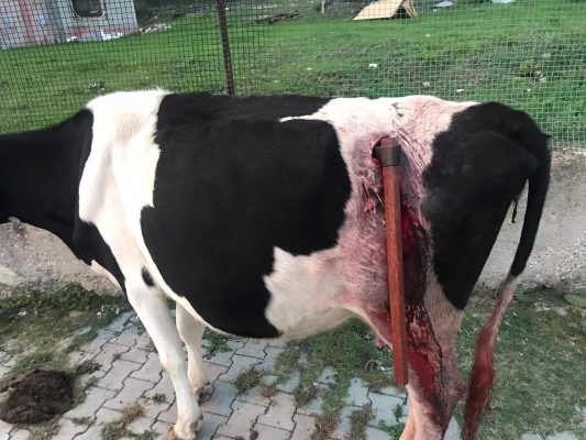 Zonguldak’ın Ereğli İlçesine bağlı Gülüç Beldesinde, arka sol kalça kısmına balta saplanmış vaziyette bulunan inek görenleri dehşete düşürdü.