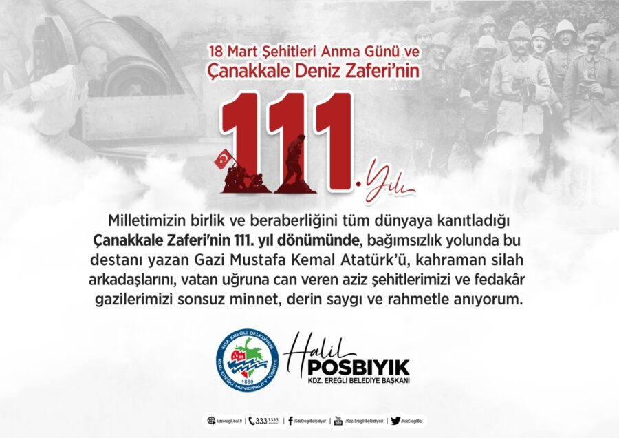 Kdz. Ereğli Belediye Başkanı Halil Posbıyık’ın 18 Mart Şehitleri Anma Günü ve Çanakkale Zaferi’nin 111. Yıl Dönümü Mesajı
