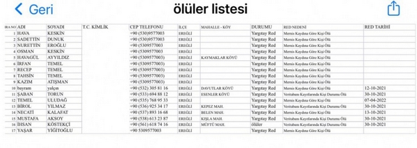 Mernis Kaydına göre ölü görünen 15 kişinin ise üyeliği Yargıtay tarafından red edildi.