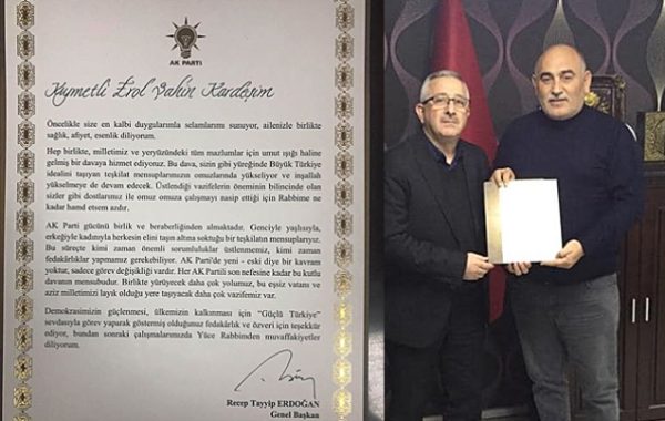 Cumhurbaşkanı Recep Tayyip Erdoğan, bir dönem Ak Parti İlçe Başkanlığı yapan isimlere teşekkür mektubu gönderdi. Ereğli’ de ilçe başkanlığı, Seçim koordinasyon başkanlığı yapan ve son olarak da 31 Mart mahalli seçimlerinde Ak Parti Belediye Başkan adayı Erol Şahin’e de mektup gönderdi. Cumhurbaşkanı Erdoğan mektubunda Şahin’e hitaben “Birlikte yürüyecek daha çok yolumuz, bu eşsiz vatanı ve aziz milletimizi layık olduğu yere taşıyacak daha çok vazifemiz var” dedi.