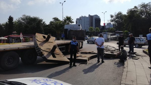Alınan bilgiye göre, Selçuk Aksoy idaresindeki 34 BYJ 045 plakalı TIR’a bağlı 67 LY 477 plakalı dorsede yüklü, dökümden oluşan yaklaşık 25 ton ağırlığındaki 3 parça vinç denge ağırlığı, aracın Terminal Kavşağı’ndan dönüşü sırasında yola devrildi.