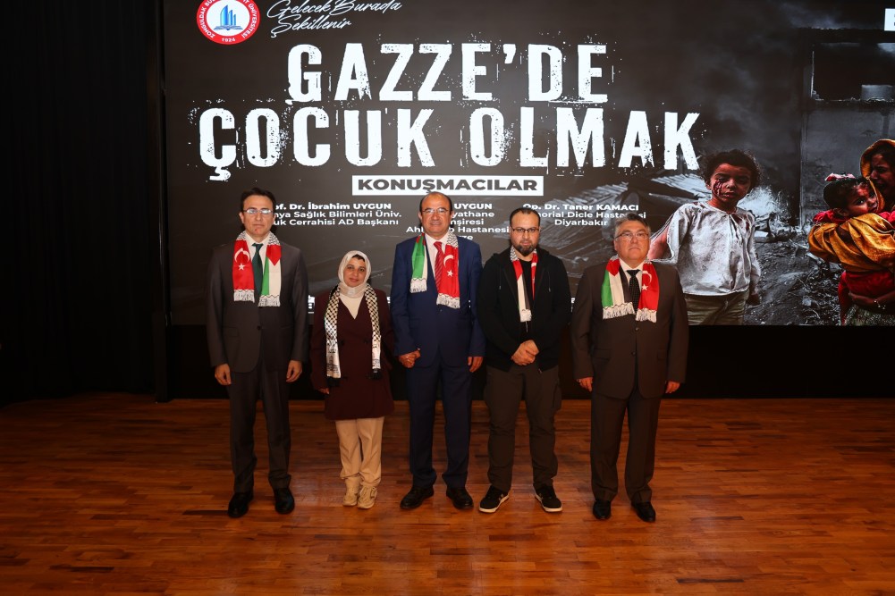 Rektör Özölçer, konuşmasının devamında ise yapılan katliama dikkat çekerek şu sözleri dile getirdi: “Gazze’de yirmi bine yakın çocuk, dünyanın gözleri önünde hayatını kaybetti. Sadece çocukların değil, insanlığın onuru da yerle bir edildi. Çocukların sevgiyle, güvenle büyümesi gereken bir zamanda; biz, bugün Gazze’de yok edilen masum çocukların yasını tutuyor, onların feryatlarını duyurmaya çalışıyoruz. Henüz birkaç gün önce, Gazze’ye insani yardım ulaştırmak için yola çıkan ‘Sumud’ filosuna yönelik yapılan barbarca saldırı insanlık tarihine yeni bir utanç lekesi olarak kazınmıştır. Sessiz kalmak, insanlığa, inanca ve ahlaka ihanettir. Bizler mazlumun yanında olacağız, zulme karşı sesimizi yükselteceğiz. Bu vesileyle böylesine anlamlı programın düzenlenmesinde emeği geçen herkese, konuşmacılarımıza ve katılımcılarımıza teşekkür ediyorum. Hep birlikte insanlığın sesini daha güçlü duyuracağız.”