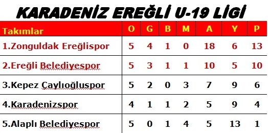 Ligin bir diAYer maA�A� ise AlaplA� Azehir StadA�nda AlaplA� Belediyespor a�� Zonguldak EreAYli Spor arasA�nda oynandA�. KarAYA�laAYmayA� Ahmet Acar ve ErtuAYrul GA�ktaAYa��A�n (pen.) golleri ile 2-0 A�nde kapatan Zonguldak EreAYli Spor ikinci yarA�da ise oyunu rA�lantiye aldA�. Umut ile farkA� 1a��e indiren AlaplA� Belediyespor bireysel hatalar yapmaya baAYlayA�nca Zonguldak EreAYli Spor DinA�er Alkan ile farkA� yeniden 2a��ye A�A�kartarak skoru 3-1 yaptA�. Zonguldak EreAYli Spor oyunda tempoyu arttA�rA�nca yeniden ErtuAYrul GA�ktaAY ile 4.golA?, Emre Kartal ile de 5.golA? bularak skoru 5-1 yaptA�. MaA�A�n son saniyesinde ise kontra ataktan Eren ile AlaplA� Belediyespor 2.ci golA? bulsa da sahadan puansA�z ayrA�ldA�. Deplasmanda 5 golle 3 puan alan Zonguldak EreAYli Spor ligde naAYmaAYlup liderliAYini sA?rdA?rA?rken AlaplA� Belediyespor ise 1 puanla ligin son sA�rasA�nda yer aldA�. Karadenizspor ise haftayA� bay geA�ti.