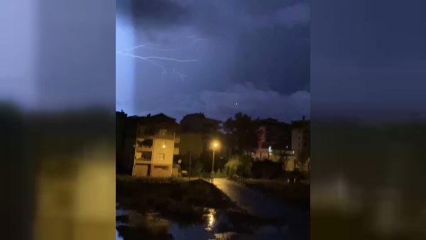 Gece geç saatlerde ilçeyi etkisi altına alan yağmur ile birlikte peş peşe şimşek çakmasıyla gökyüzünü aydınlattı. Gökyüzünü mavi ve beyaza boyayan şimşekler renkli görüntüler oluşturdu. O anlar cep telefonu ile saniye saniye görüntülendi.
