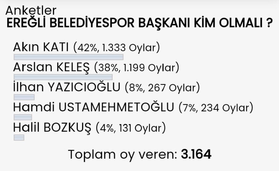 Spor camiasının sevilen yüzü olan Akın Katı ankette kullanılan 3164 oyun 1333’nü alırken ikinci sırada ise beklenenin aksine 1199 oy ile Kdz Ereğli Ticaret Odası Başkanı Arslan Keleş yer aldı. Okuyucularımızın teveccühünü alan bu iki isimin yanı sıra mevcut Ereğli Belediyespor Başkanı ve İş İnsanı Halil Bozkuş ise ankette kendine son sırada yer buldu. Diğer adaylardan İş İnsanı İlhan Yazıcıoğlu 267 oyda kalırken Hamdi Ustamehmetoğlu ise 234 oy aldı.
