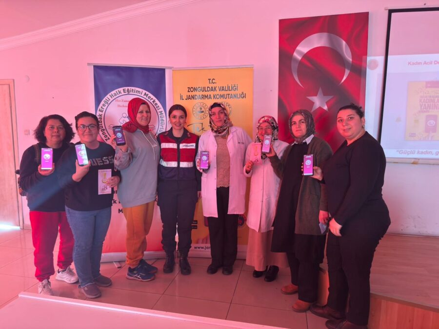 Seminer sonunda KADES broşürleri dağıtıldı. Uygulama, kursiyerlerin telefonlarına yükletilerek bilinçlendirildi.