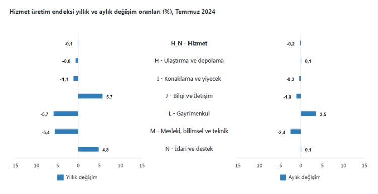 TÜİK’in açıkladığı Temmuz ayı Hizmet Üretim Endeksi aylık ve yıllık bazda azalış kaydetti. Aylık bazda gayrimenkul hizmeti, yıllık bazda ise bilgi ve iletişim sektörü artış kaydetti.