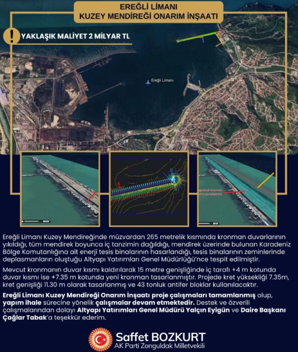 AK Parti Zonguldak Milletvekili Saffet Bozkurt, Ereğli Limanı Kuzey Mendireği Onarım İnşaatının yaklaşık maliyetinin 2 milyar TL olduğu ve projenin çalışmalarının tamamlanıp yapım ihale sürecine yönelik çalışmalar devam ettiğini söyledi.