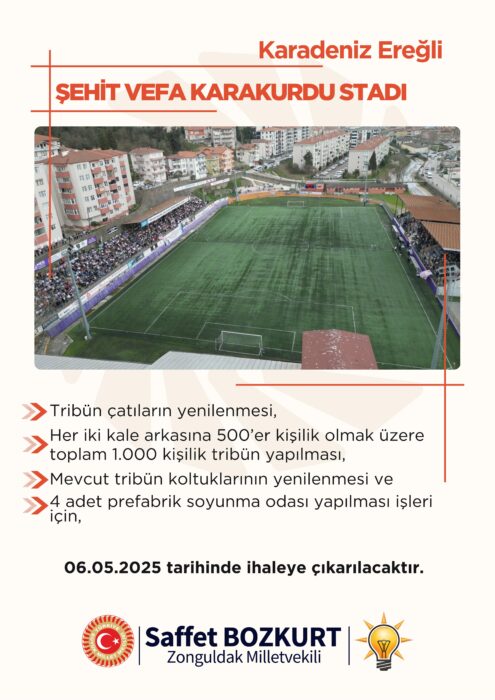 Bozkurt’un açıklaması şu şekilde: “Karadeniz Ereğli Şehit Vefa Karakurdu Stadı’nda, tribün çatıların yenilenmesi, her iki kale arkasına 500’er kişilik olmak üzere toplam 1.000 kişilik tribün yapılması, mevcut tribün koltuklarının yenilenmesi ve 4 adet prefabrik soyunma odası yapılması işleri için 06 Mayıs 2025 tarihinde ihaleye çıkarılacaktır.