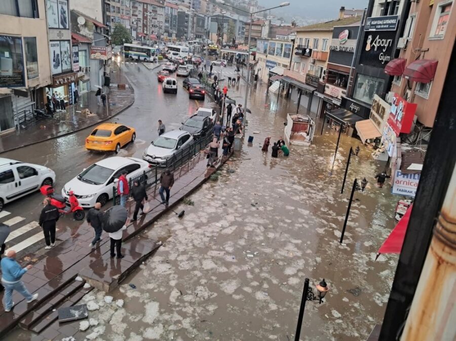 Kdz. Ereğli’de akşam saatlerinde aniden bastıran fırtına, dolu ve sağanak yağmur ilçe merkezini adeta felç etti. Kısa sürede etkisini artıran yağışla birlikte cadde ve sokaklar göle dönerken, trafikte uzun araç kuyrukları oluştu.