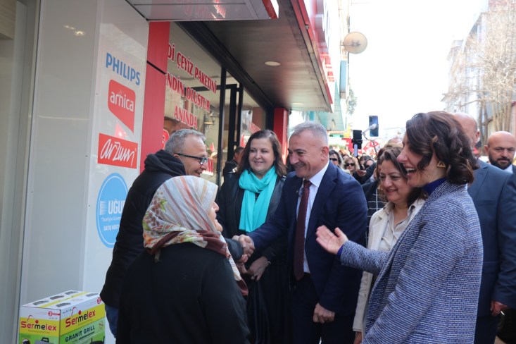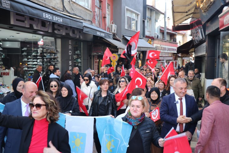 İYİ Parti Kdz. Ereğli Belediye Başkan Adayı Murat Sesli, İYİ Parti Kdz. Ereğli İlçe Başkanı Yasemin Erdoğan, 1. Sıra meclis üyesi adayı Op. Dr. Evrim Balbaloğlu, Kdz. Ereğli Belediyesi önceki dönem belediye başkanlarından Murat Sesli ve beraberindeki yaklaşık 500 kişi Meydanbaşı’ndan başlayarak çarşı içi ve pazaryeri esnafını gezerek projelerin yer aldığı katalog ve broşürleri dağıtıp destek istedi.