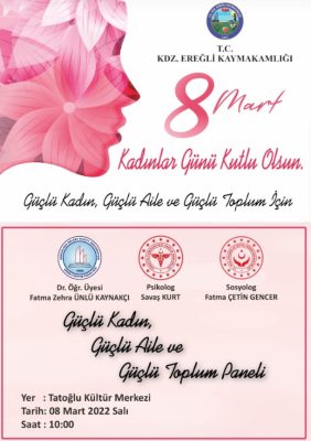 Kdz Ereğli Kaymakamı Sayın Mehmet YAPICI himayelerinde, Kdz Ereğli Sosyal Hizmet Merkezi Müdürlüğü koordinesinde Bülent Ecevit Üniversitesi Ereğli Eğitim Fakültesi Dekanlığı ve Kdz Ereğli Devlet Hastanesi Başhekimliği işbirliğince 8 Mart salı günü Tatoğlu Kültür Merkezinde saat 10.00 da gerçekleşecek panele tüm Ereğli halkımız davetlidir.