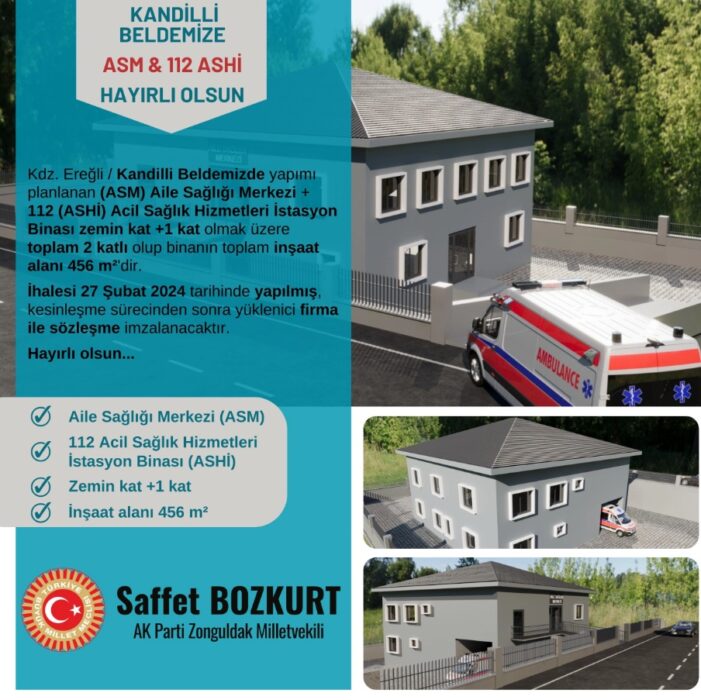 Aile Sağlık Merkezi ve Acil Sağlık Hizmetleri İstasyonu binasının sözleşmesinin imzalanacağını ifade eden Ak Parti Zonguldak Milletvekili Saffet Bozkurt: “Kdz. Ereğli / Kandilli Beldemizde yapımı planlanan (ASM) Aile Sağlığı Merkezi + 112 (ASHİ) Acil Sağlık Hizmetleri İstasyon Binası zemin kat +1 kat olmak üzere toplam 2 katlı olup binanın toplam inşaat alanı 456 m²’dir.