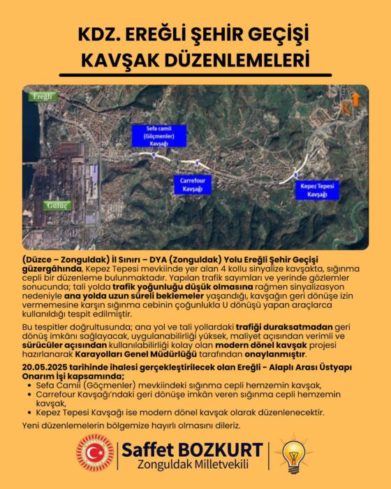 Saffet Bozkurt’un yaptığı açıklama şöyle: “Düzce – Zonguldak İl Sınırı – DYA Zonguldak Yolu Ereğli Şehir Geçişi güzergâhında, Kepez Tepesi mevkiinde yer alan 4 kollu sinyalize kavşakta, sığınma cepli bir düzenleme bulunmaktadır. Yapılan trafik sayımları ve yerinde gözlemler sonucunda; tali yolda trafik yoğunluğu düşük olmasına rağmen sinyalizasyon nedeniyle ana yolda uzun süreli beklemeler yaşandığı, kavşağın geri dönüşe izin vermemesine karşın sığınma cebinin çoğunlukla U dönüşü yapan araçlarca kullanıldığı tespit edilmiştir.