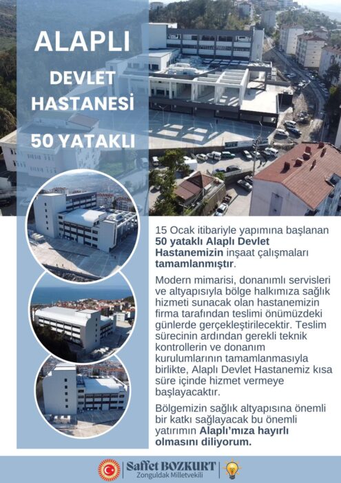 Milletvekili Bozkurt, “Teslim sürecinin ardından gerekli teknik kontrollerin ve donanım kurulumlarının tamamlanmasıyla birlikte, Alaplı Devlet Hastanemiz kısa süre içinde hizmet vermeye başlayacaktır. Bölgemizin sağlık altyapısına önemli bir katkı sağlayacak bu yatırımın Alaplı’mıza hayırlı olmasını diliyorum.” ifadelerini kullandı.
