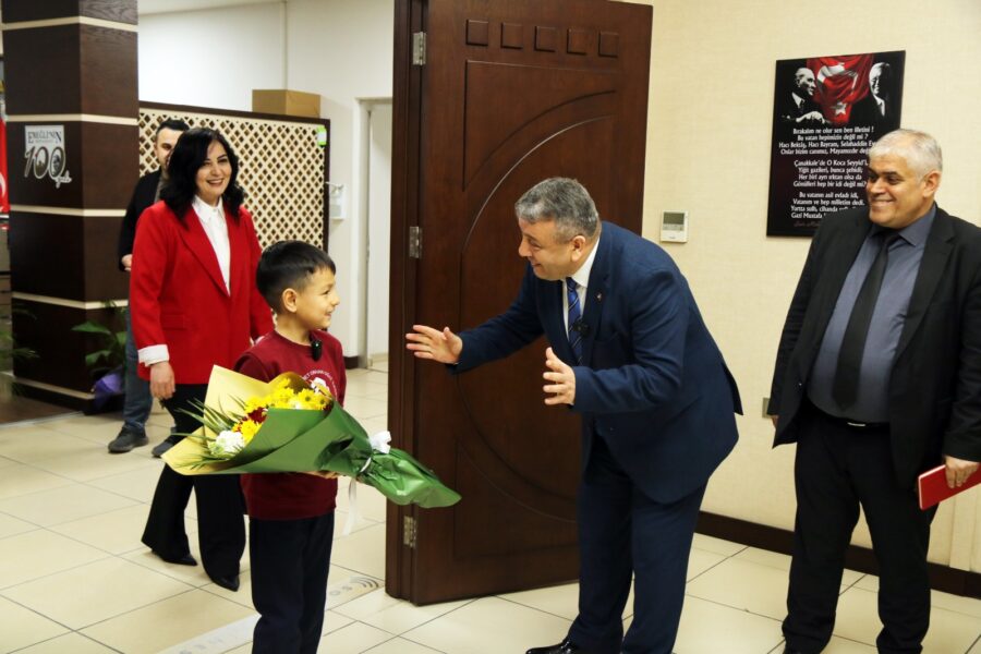Okul Müdürü Begüm Ercan, sınıf öğretmeni Ayşe Oylum Uslucuk, anne ve babası Sibel-Enis Akbaş’la birlikte Başkanvekili Muharrem Sağlam ve başkan yardımcıları tarafından makamda karşılanan Deniz Kadir Akbaş çiçek takdiminde bulundu. Koltuğa oturan Akbaş, tüm çocukların Ulusal Egemenlik ve Çocuk Bayramı’nı kutladı.