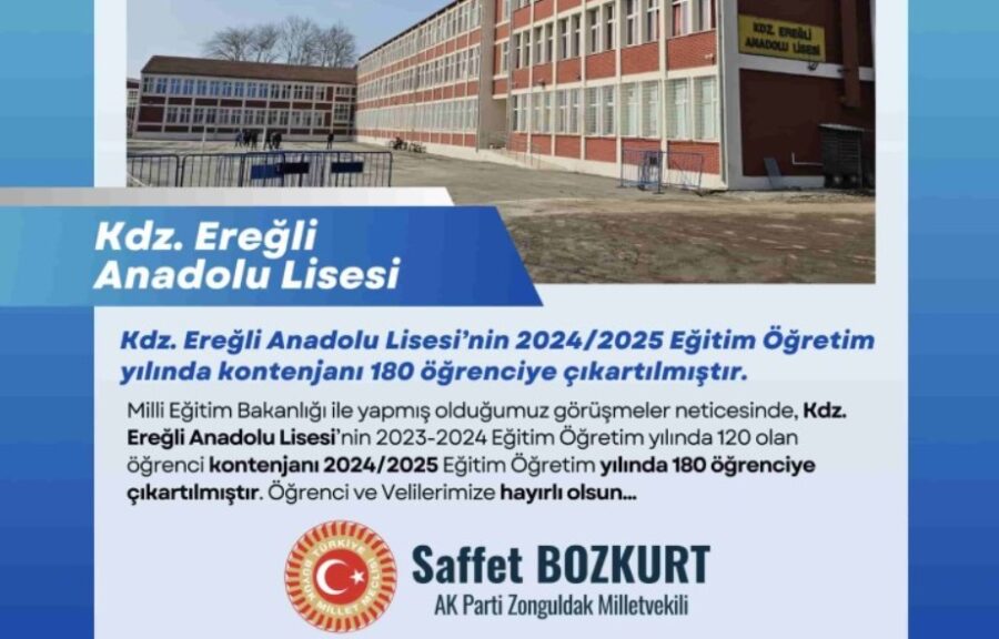 AK Parti Zonguldak Milletvekili Saffet Bozkurt, yazılı bir açıklama yaparak; Kdz. Ereğli Anadolu Lisesi kontenjanı’nın 180 öğrenciye çıkartıldığını belirtti.