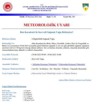 Meteoroloji uyardı: Gök gürültülü sağanak yağış geliyor… Meteoroloji, yeni bir uyarı yaptı…Buna göre, 29 Haziran Çarşamba günü; yerel olarak gök gürültülü sağanak yağış beklendiğinden sel, su baskını, heyelan, yıldırım, ulaşımda aksamalar gibi olumsuzluklara karşı dikkatli ve tedbirli olunması gerektiği vurgulandı.