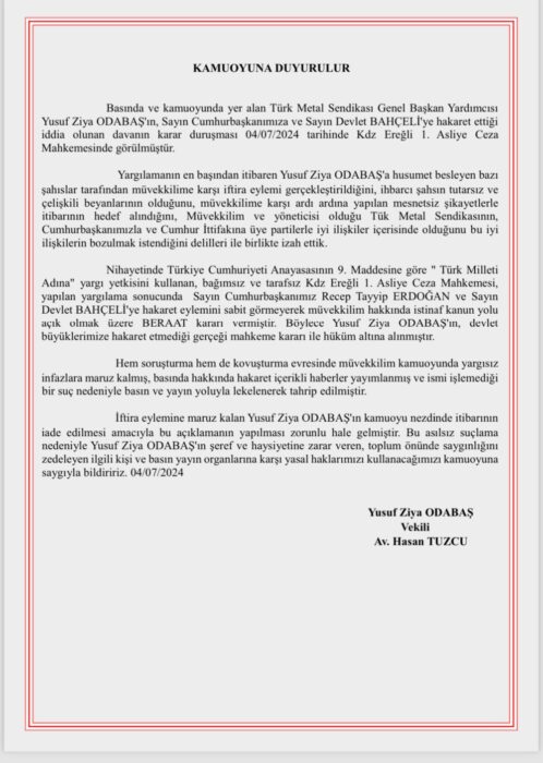 Türk Metal Sendikası Genel Başkanı Yardımcısı Yusuf Ziya Odabaş, Cumhurbaşkanı Recep Tayyip Erdoğan ve MHP lideri Devlet Bahçeli’ye hakaret iddiasıyla yargılandığı davada beraat etti.
