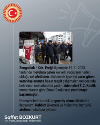 AK Parti Zonguldak milletvekili Saffet Bozkurt konuya ilişkin yaptığı açıklamada “Karadeniz Ereğli ilçemizde 19.11.2023 Pazar günü meydana gelen kuvvetli yağışların neden olduğu sel afetinden etkilenerek işyerleri zarar gören vatandaşlarımıza hasar tespit çalışmaları neticesinde belirlenen miktarlardaki yardım ödemeleri T.C. Kimlik numaralarına göre Ziraat Bankasına yatırılmaya başlanmıştır. Hemşehrilerimize tekrar geçmiş olsun dileklerimi iletiyorum. Rabbim ülkemizi ve milletimizi her türlü afetten muhafaza eylesin.” dedi.