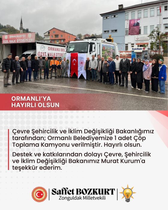Konuya ilişkin açıklamada bulunan AK Parti Zonguldak Milletvekili Saffet Bozkurt, “Çevre, Şehircilik ve İklim Değişikliği Bakanlığımız tarafından Ormanlı Belediyemize 1 adet çöp toplama kamyonu verilmiştir. Hayırlı olsun. Destek ve katkılarından dolayı Çevre, Şehircilik ve İklim Değişikliği Bakanımız Sayın Murat Kurum’a teşekkür ederim.” ifadelerini kullandı.
