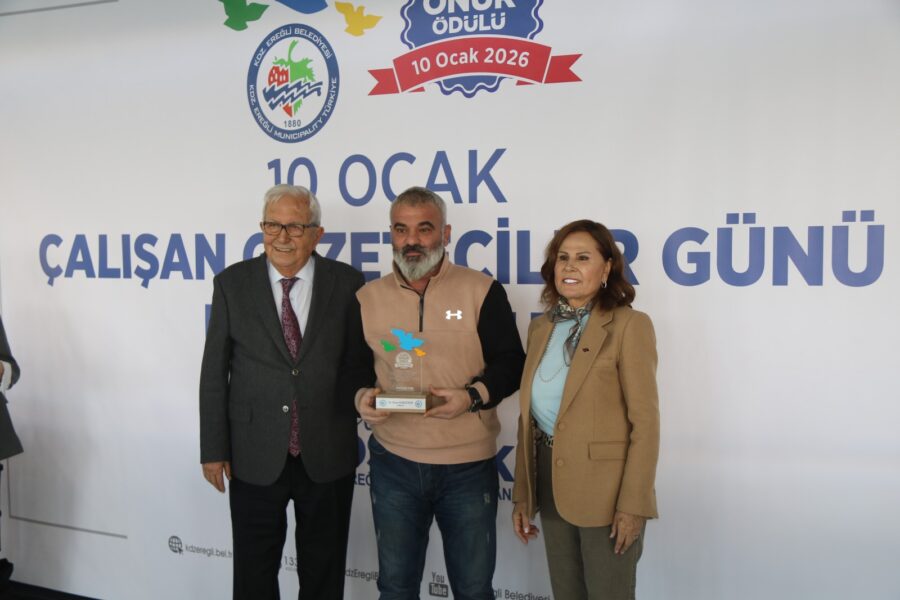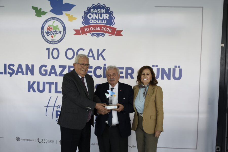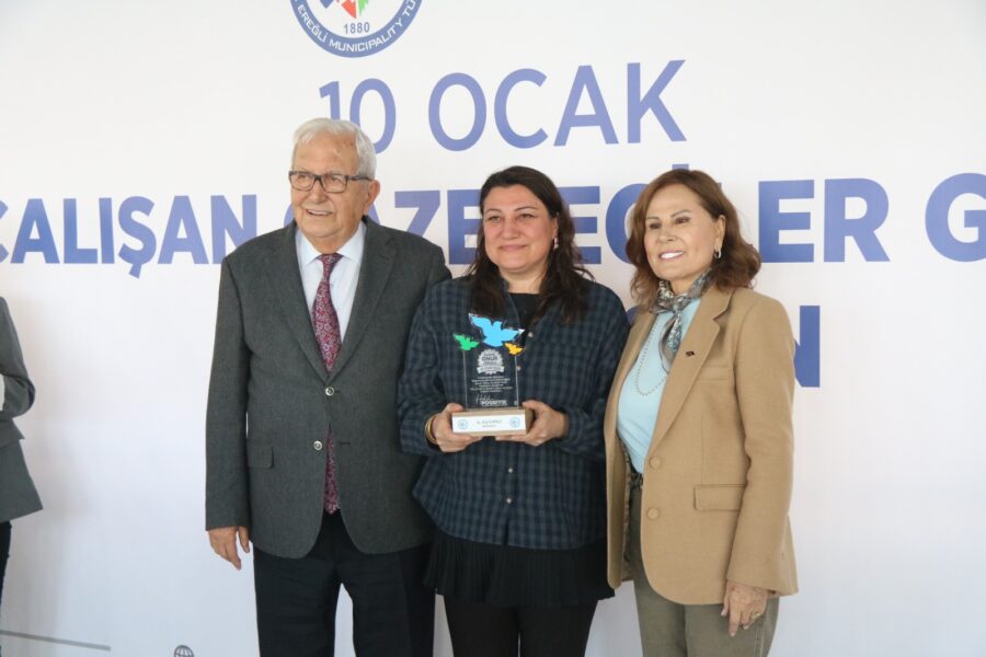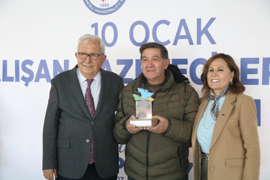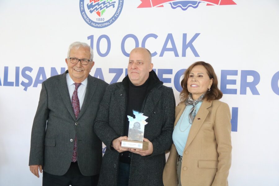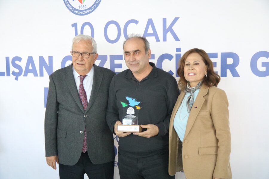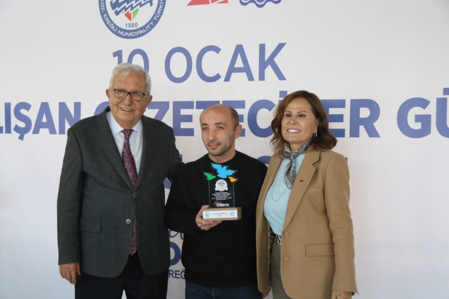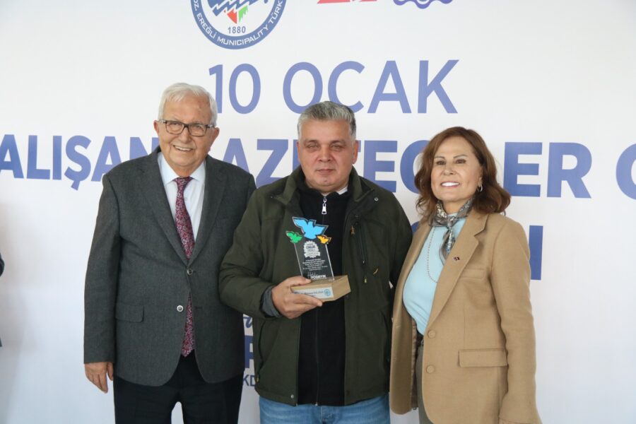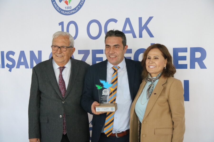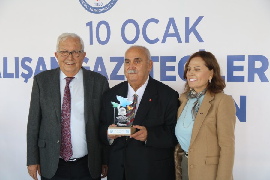 Başkan Posbıyık ve eşi Neriman Posbıyık, 25 yıl ve üzerinde Ereğli’de gazetecilik mesleğine emek veren Sina Çıladır, Necati Günay, Şafak Erel, Kurtuluş Ayyıldız, Hüseyin Orhan, Altan Akçakese, Ali Ceylan, Fikri Kapan, Doğan Gönüllü, Hasan Sarıalp, İsmet Keskin, Sinan Kabatepe, Mustafa Kemal Bektaş, Bilgin Avcı, Özge Cerrah, Serpil Kasapoğlu, Seyhan Dikay, İlknur Turt, Derya Gökbulut Sağlam, Tuncay Tokay, Yasin Ören, Serkan Aydemir, Yusuf Zobar, Muhammet Balaban, Ersen Berk Çelik, Elif Yapıcı, Hülya Çoker, Sibel Pınar, Arzu Tekin, Erdoğan Kutlu, Hakan Kurttekin, Hasan Haşıl, İbrahim Solmaz, Haydar Yağız, Recep Akkaya ve Şafak Negüzel’e ‘Basın Onur Ödülü’ plaketi takdim etti.