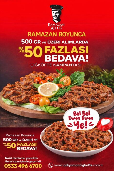 Müftü Mahallesi Erdemir Caddesi’nde, Ereylin AVM yanında hizmet veren Ramazan Altuğ Adıyaman Çiğköfte, Ramazan ayı boyunca 500 gram ve üzeri alımlarda %50 fazlasını bedava veriyor.