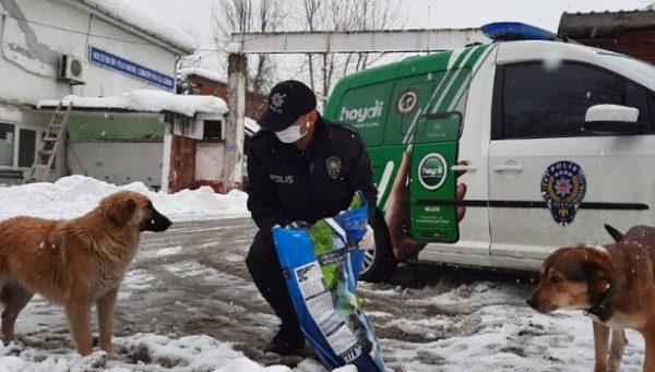 Zonguldak İl Emniyet Müdürlüğü Çevre, Doğa ve Hayvanları Koruma ekipleri soğuk kış şartları nedeniyle mama ve su bulmakta zorlanan sokak hayvanlarının yanında olmaya devam ediyor.