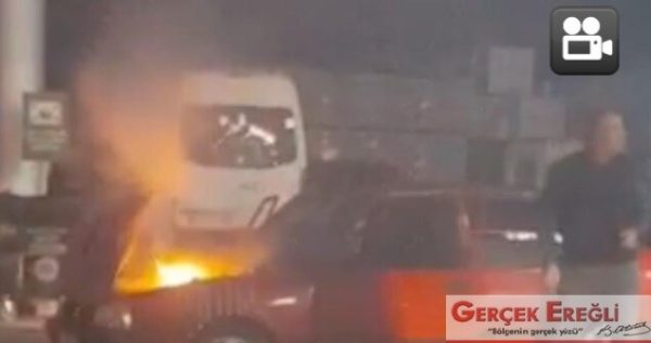 Zonguldak’ın Ereğli İlçesinde, motor kısmı alev alan otomobilin sürücüsü son anda kurtuldu.