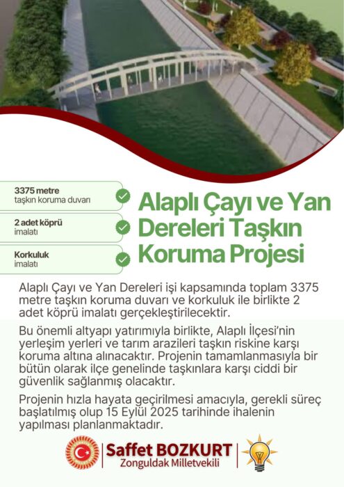 Bu önemli altyapı yatırımıyla birlikte, Alaplı İlçesi’nin yerleşim yerleri ve tarım arazileri taşkın riskine karşı koruma altına alınacaktır. Projenin tamamlanmasıyla bir bütün olarak ilçe genelinde taşkınlara karşı ciddi bir güvenlik sağlanmış olacaktır.