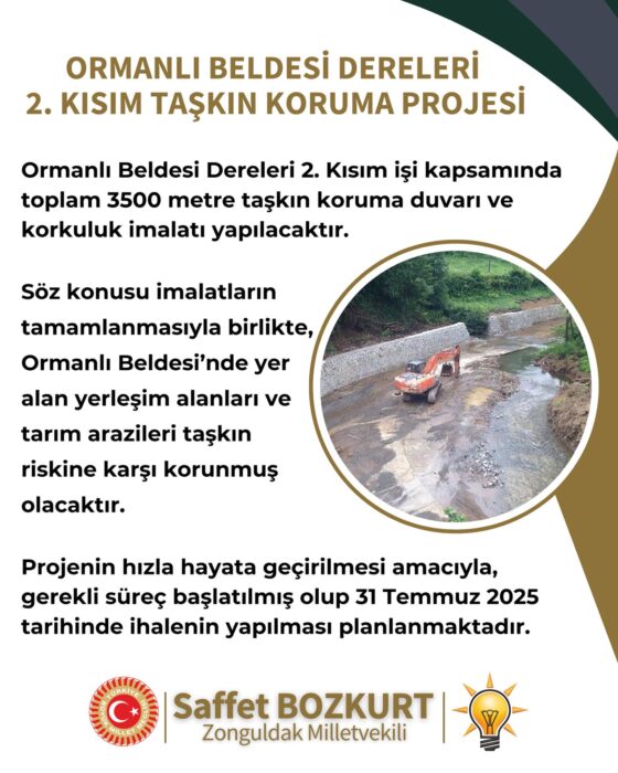 Söz konusu imalatların tamamlanmasıyla birlikte, Ormanlı Beldesi’nde yer alan yerleşim alanları ve tarım arazileri taşkın
