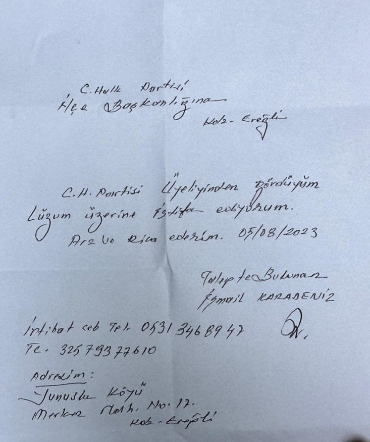 Konuyu aktardığı CHP Kdz.Ereğli İlçe Yönetiminden bir cevap alamadığını sözlerine ekleyen Karadeniz CHP üyeliğini yazdığı dilekçe ile CHP Kdz.Ereğli İlçe Örgütüne ulaştırdı.