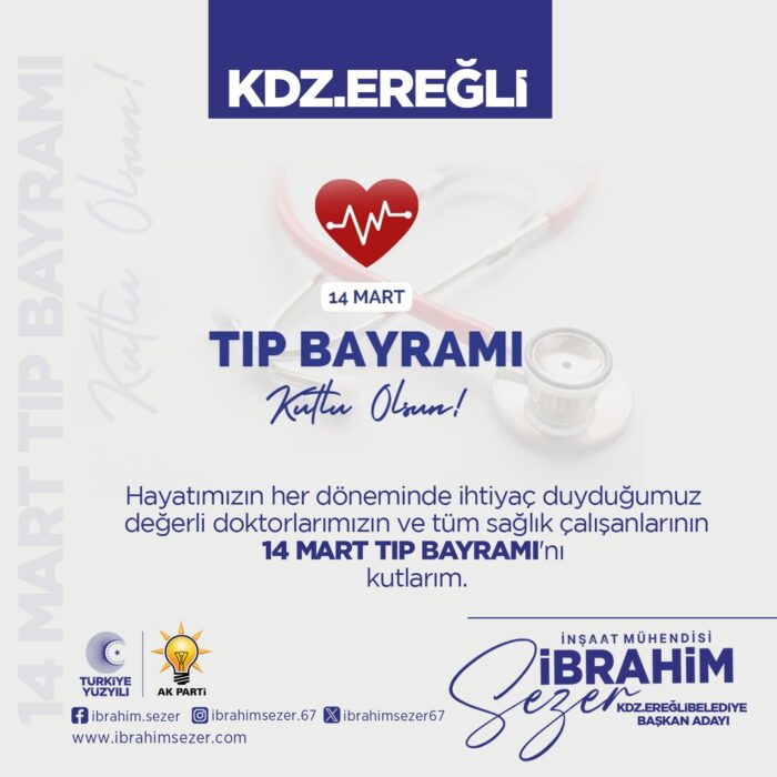 Kdz. Ereğli Belediye Başkan Adayı İbrahim Sezer, 14 Mart Tıp Bayramı dolayısıyla yayınladığı mesajında, halk sağlığı mücadelesinde yoğun mesai harcayan doktorların ve sağlık çalışanların 14 Mart Tıp Bayramını kutladı.