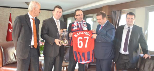 Mehmet Muharrem Kasapoğlu’nu makamında ziyaret ederek Zonguldakspor’a destek talebinde bulundu. Kulüp Başkanı Caner dün beraberinde Zonguldak Kent Konseyi Başkanı Yesari Sezgin ve Hasan Yücel ile birlikte önce Ak Parti Zonguldak Milletvekili Özcan Ulupınar’ı ziyaret ederek bilgi alışverişinde bulunuldu. Daha sonra Spor Toto Teşkilatı Başkanı Mehmet Muharrem Kasapoğlu’nu makamında ziyaret edildi. Milletvekili Ulupınar’ın katkıları ile olumlu geçen görüşmede Caner Kasapoğlu’na Zonguldakspor forması ve madenci heykeli hediye ederek destek taleplerinde bulundu. Ak Parti Zonguldak Milletvekili Özcan Ulupınar’da ziyaret sırasında takıma destek sağlanması adına olumlu girişimlerde bulundu.