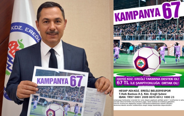 BA�lgesel AmatA�r Lig 6.Grupta AYampiyonluk mA?cadelesi veren Kdz. EreAYli Belediyespor KulA?bA? a�?Kampanya 67a�? adA� ve a�?Haydi Kdz. EreAYli takA�mA�na destek ol. 67 TL ile AYampiyonluAYa ortak ol a�? sloganA� ile destek kampanyasA� baAYlattA�.