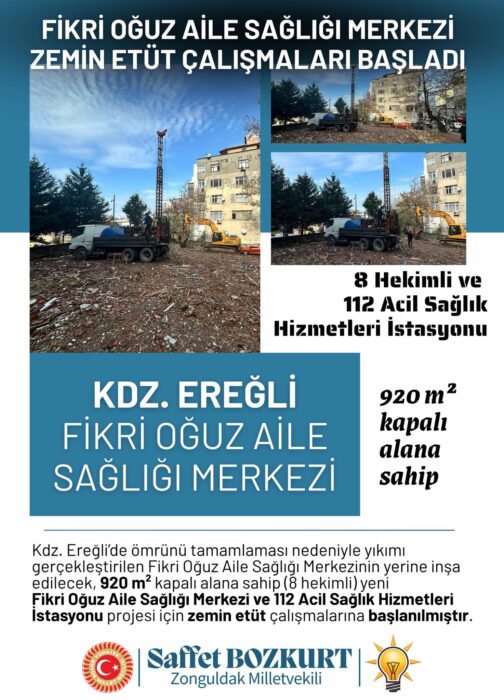 “Kdz. Ereğli’de ömrünü tamamlayan Fikri Oğuz Aile Sağlığı Merkezi’nin yerine yapılacak 8 hekimli yeni Aile Sağlığı Merkezi ve 112 Acil Sağlık Hizmetleri İstasyonu için zemin etüt çalışmalarına başlanmıştır. İlçemize ve vatandaşlarımıza hayırlı olsun.”