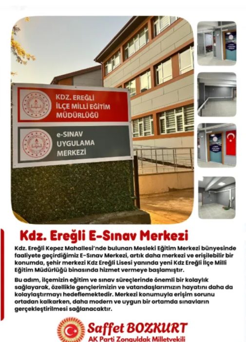 Ak Parti Zonguldak Milletvekili Av. Saffet Bozkurt konu ile ilgili olarak yaptığı açıklamada “İlçe Başkanlığım döneminde. Ereğli Kepez Mahallesi’nde bulunan Mesleki Eğitim Merkezi bünyesinde faaliyete geçirdiğimiz E-Sınav Merkezi, artık daha merkezi ve erişilebilir bir konumda, şehir merkezi Kdz Ereğli Lisesi yanında yeni Kdz Ereğli İlçe Milli Eğitim Müdürlüğü binasında hizmet vermeye başlamıştır. Bu adım, ilçemizin eğitim ve sınav süreçlerinde önemli bir kolaylık sağlayarak, özellikle gençlerimizin ve vatandaşlarımızın hayatını daha da kolaylaştırmayı hedeflemektedir. Merkezi konumuyla erişim sorunu ortadan kalkarken, daha modern ve uygun bir ortamda sınavların gerçekleştirilmesi sağlanmıştır. Görev sürem boyunca Zonguldak’ımızın ile İlçelerinin gelişimi ve hemşehrilerimizin ihtiyaçlarının karşılanması için her zaman çalıştım ve çalışmaya da devam edeceğim. Bu güzel projeyi hayata geçirmenin mutluluğunu bir kez daha yaşıyorum. Emeği geçen tüm paydaşlarımıza teşekkür eder, E-Sınav Merkezi’mizin Kdz. Ereğli’mize hayırlı ve uğurlu olmasını temenni ederim. Birlikte daha güzel yarınlara!”
